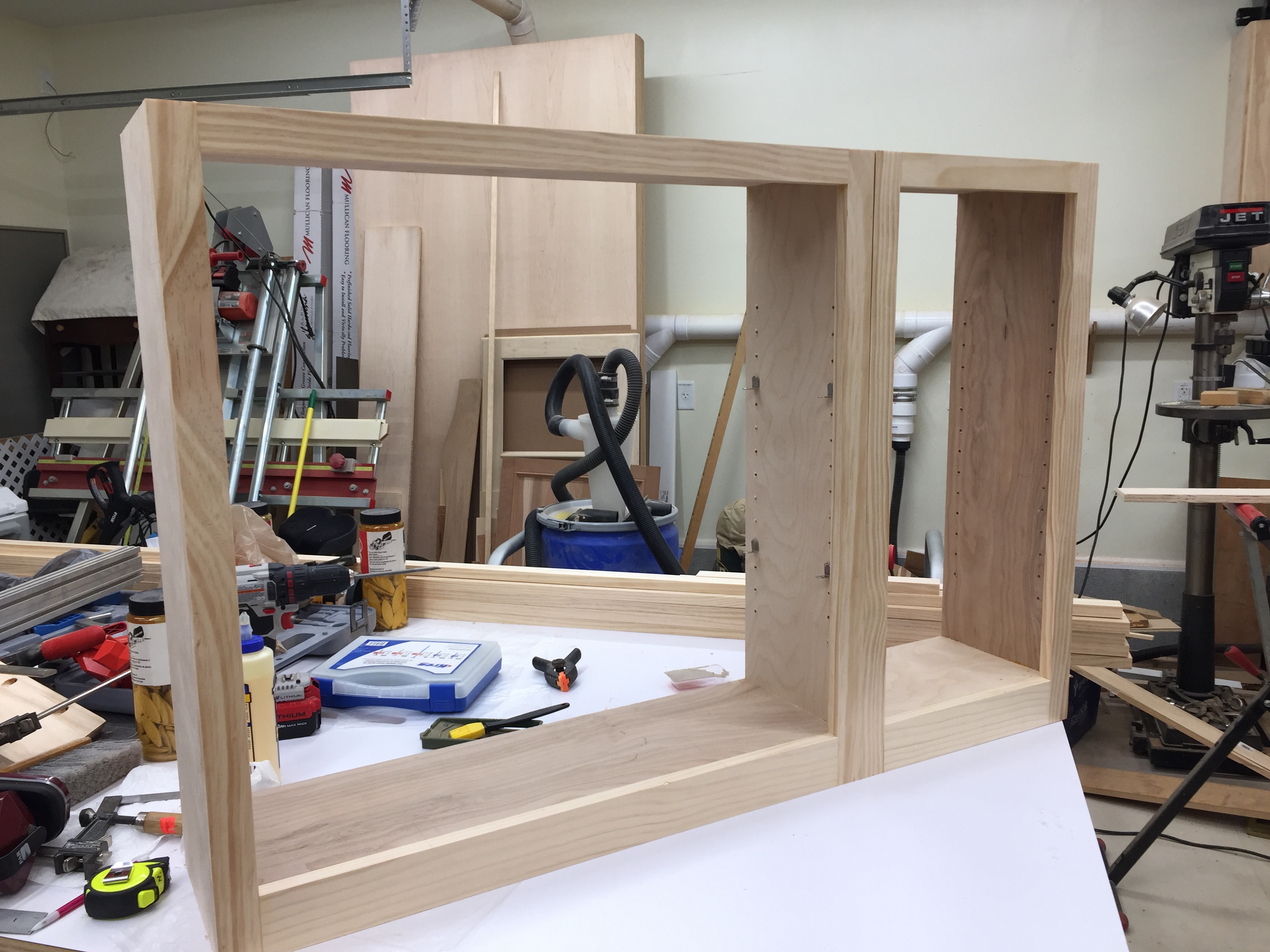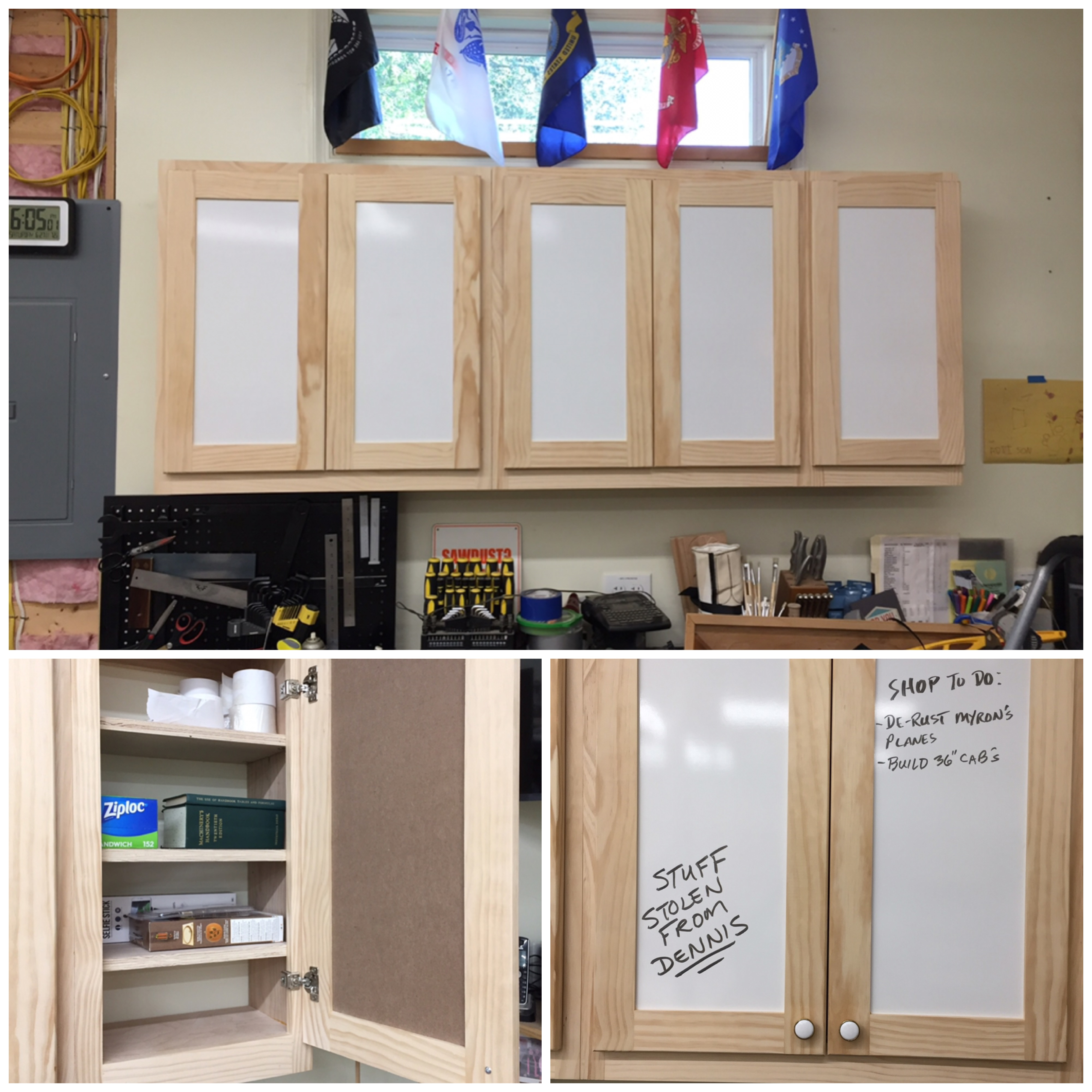 When the construction for my dream wood shop was complete, the budget got tight as I started to outfit the shop with things like dust collection piping, air conditioning, etc. Some shop projects on my priority list had to be placed on hold. As time went on, I knew that my much needed shop cabinets had to jump to the top of the priority list because items that should be stored in cabinets, were stacked on the floor and on much needed horizontal work spaces. Early on, I tinkered with the “make” or “buy” decision. I spent a considerable amount of time researching on-line for the cheapest cabinets that would also meet my needs. I was not thrilled by the construction nor the material used and the less expensive cabinets were still too expensive. So, I started pricing out material to build my own cabinets. Occasionally I would stop at thrift stores to search for bargains. One day, I discovered a large bag of 33 used European style cabinet hinges for only $4.95. This was a great find because European cabinet hardware can be expensive. In previous visits to thrift stores I had managed to score bundles of used cabinet hardware (pulls and knobs), at bargain prices. All I needed now was the wood to move forward with the cabinet build. Last year at one of our Tidewater Woodworkers Guild meetings Andy Steinberg (one of our past presidents) asked if anyone was interested in purchasing plywood at a reasonable price. I couldn’t raise my hand fast enough. Thanks to Andy, myself and other guild members were able to get quality 3/4” thick plywood at a very reasonable price. Thank you Andy. Because the European hinges were face frame type hinges with a half inch overlay, the decision to build face frame style cabinets was an easy one. For simplicity, I decided to build shaker style doors. I used graph paper to help me figure out a cut list and to help me get the most out of each plywood sheet in order to minimize waste. After slicing up the plywood for 3 of the cabinets, I did a dry fit. I used pocket hole joinery and glue to construct the boxes. Before attaching the face frames I used a Kreg jig to drill holes for the shelf pins. As you can see in this picture, there are no backs to these cabinet carcasses. That’s because I’m cheap. That required special attention to keeping the boxes absolutely square during the assembly and glue up process. The face frames helped with keeping them square. It worked out perfectly. I mounted the cabinets to wall studs using a traditional ledger strip affixed to the inside top of each cabinet. Each cabinet is also screwed to the adjoining one through the edge of the face frame. Now on to the doors. Shaker style doors use mortise and tenon joinery. The panels are usually simple. I like the idea that some woodworkers have used white board material for their cabinet door panels. This allows you to use dry erase markers so you can write on the cabinets. So, I decided to use whiteboard panels on a few of the doors. For other cabinets, I used hardboard for the door panels. I saved a lot of money doing these myself and I like how they turned out. More importantly I was able to make them to suit my needs and specifications. I still have many more to build. I just have to decide what finish to apply. Karl Bogot has also been busy pulling lumber out of the scrap pile and making some interesting projects. Project 20-16. This is another in my 'treasure from scrap from scrap series'. The original project, a laminated solid cherry kitchen counter, yielded a large cutout for the sink. That cutout was resized to become a large cutting board. Too long, we cut off one end, leaving a 4 inch piece of laminated cherry some 18 inches long. I took that one, cut it into sections and glued it up into a 4 inch cube. Then, I sliced off 7/16 inch pieces, sanded, and finished them to a set of six 4-inch coasters. Waste not. Want not. (Oh, I have a 4x4x1/4" piece left. Any ideas?) Project 20-12 is a cutting board made from American Sycamore with Maple highlights and trimmed with thin strips of cherry and walnut. This wood had been hanging around the dark reaches of my woodpile. The gorgeous grain is surprisingly tight and the wood is heavy and dense. It measures 16 x 12 x 1.25. I'm going to put it up on Etsy for $100 + $15 shipping. Local friends get free delivery (with proper social distancing.) I have another Sycamore board in process, along with two made from Cherry. Think Christmas gifts, wedding presents and house warming.