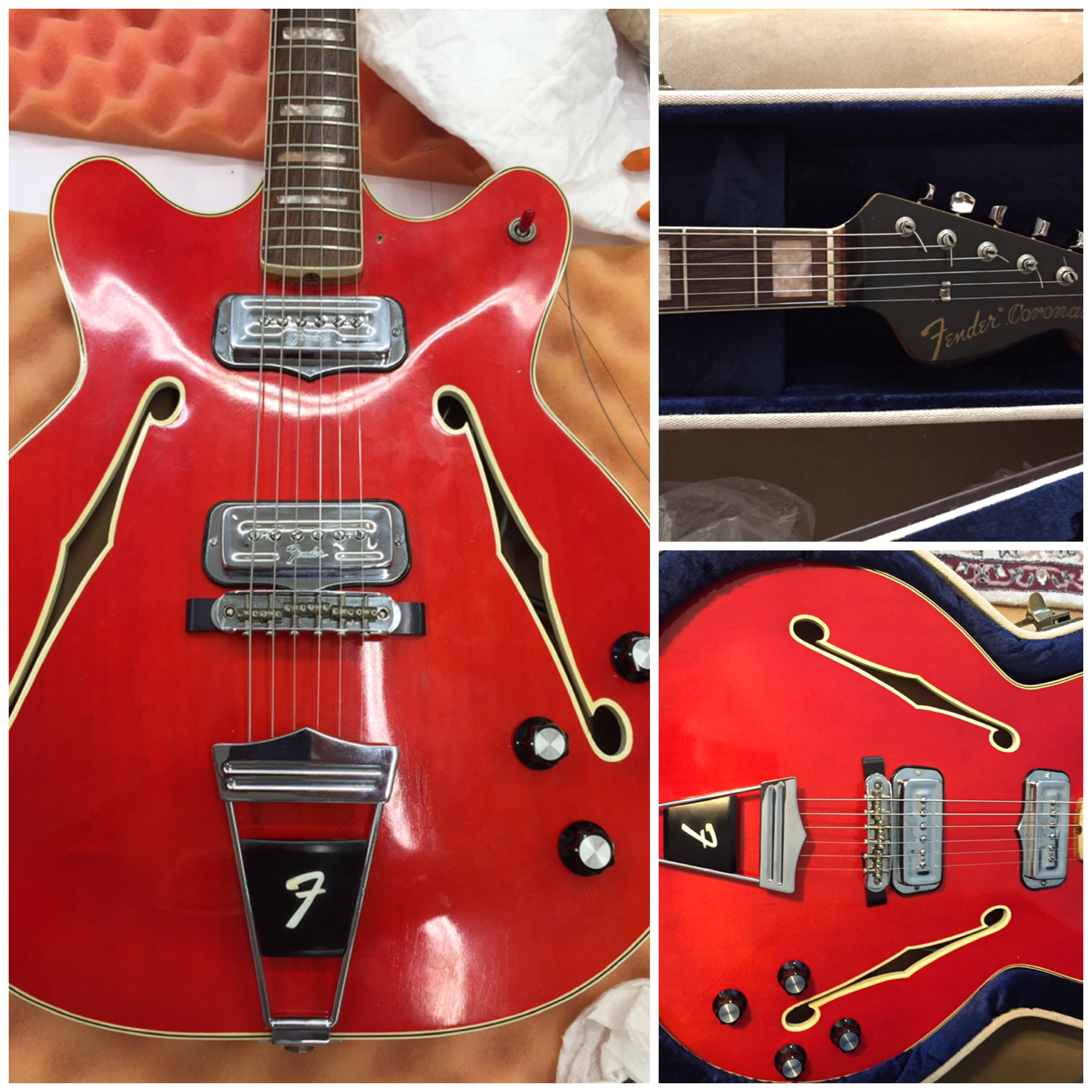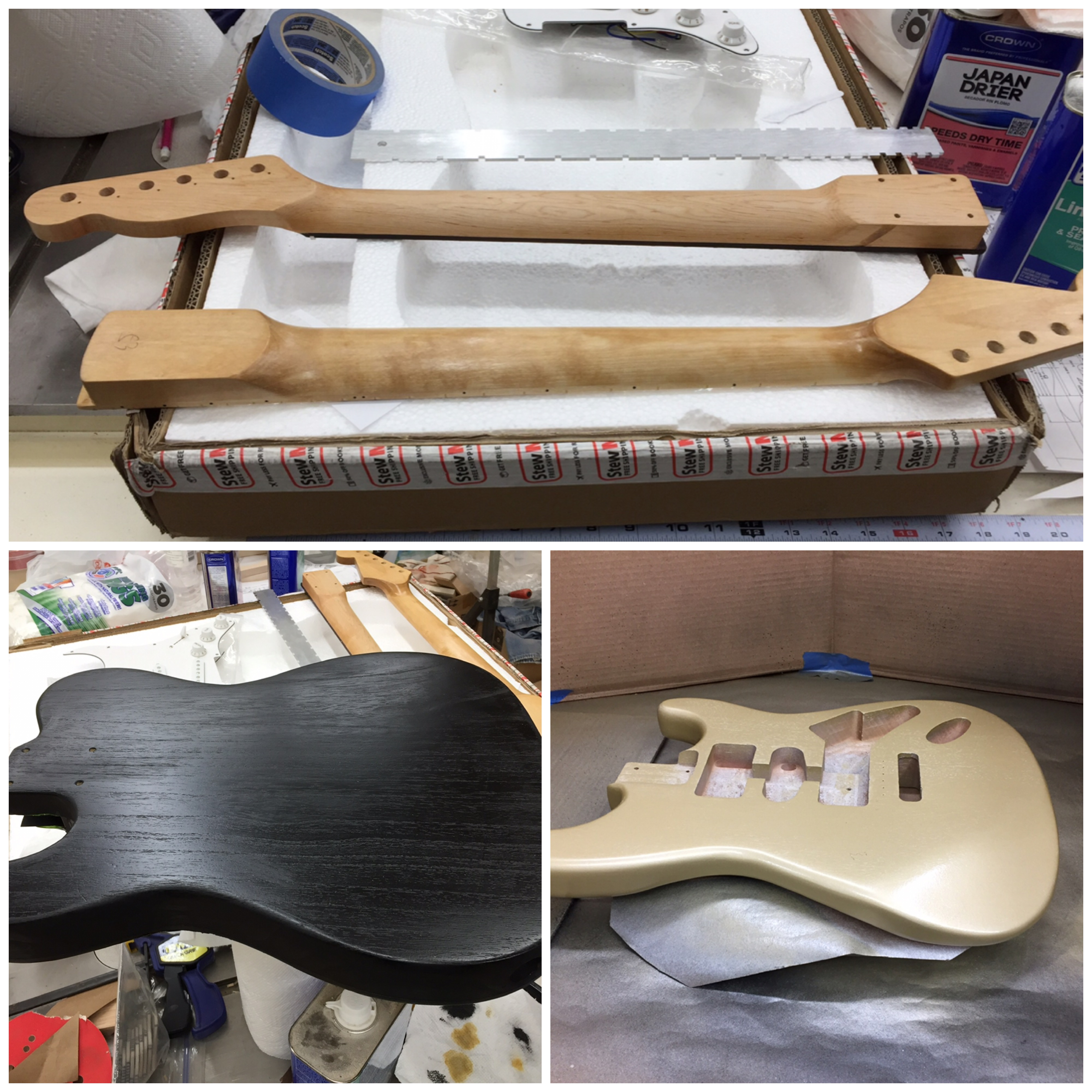 Guild member Don Newsome has also been busy in his shop with two different projects, guitar building and shop and storage cabinets. One of my woodworking goals is to scratch build guitars (both electric and acoustic). This requires special luthier tools as well as understanding the techniques and processes used to produce a quality instrument. One of my woodworking goals is to scratch build guitars (both electric and acoustic). This requires special luthier tools as well as understanding the techniques and processes used to produce a quality instrument. The final step includes the proper setup of the instrument in order to satisfy the requirements of the musician who will play it. Guitar players are a unique group of musicians and no two players seem to agree on what gage strings are best, how high or low the string action should be, and what type of frets to use. To date, I have built 3 guitars from kits (one acoustic and two electric). These kits required much hand work to complete but the experience allowed me to gain some valuable luthier knowledge and experience. The above guitars are clones of two of the most popular electric guitars ever built (the Fender Stratocaster and Telecaster). I built these for my two grandsons. Note the decals I created for the headstock which has my LumberCutter logo as well as my grandson’s names mixed in with the guitar style name (IanCaster and TeleJohn). The acoustic guitar: This acoustic guitar was a real challenge. Built during a 3 day course at the Woodcraft store. The course was intense but very satisfying and this inspired me to want to build more. This guitar mimics a Martin style acoustic with maple back and sides with a sitka spruce sound board. Along my luthier journey I’ve also accomplished repairs to a couple of guitars in order to bring them back to a playable condition. Luthiers know that repairing guitars is a valuable way to improve your instrument building skills. I also have a background in electronics, this has been very helpful in also troubleshooting problems with electric guitar circuitry. Recently I had the opportunity to repair a 1966 Fender Coronado II Hollow Body acoustic/electric guitar. A guitar that is 56 years old. It was not a playable instrument because it had multiple issues both mechanically and electrically. Several years ago someone had decided that it would be a great idea to replace the original neck pickup with one from a Gibson brand guitar. In doing so, they took a saw to the body cavity at the neck to accept the wider Gibson pickup. The modification devalued this vintage guitar. The bridge was also rusted and one of the tuners was broken. Adding to the problem, the volume and tone controls were not responding properly when plugged into an amplifier. Getting to the electronics is tough on this type of body style so before I decided to go through the effort to take it apart, I wanted to inspect all the wiring connections first. This required a peek inside the body. In my tool box of goodies is a bore scope which allows me to peek inside some really tight spaces. It has a camera with a dimmer controlled light and it connects to my iPhone so I can see what it sees and I can also take pictures. In peeking around inside the body cavity I discovered a broken ground wire on the sleeve of the input jack. The ground wire from the large gray wire is suppose to be soldered to the input jack. It had broken off due to a very sloppy solder job as the picture shows. I decided the only proper action for this guitar was to try and bring it back to its original 1966 glory by using genuine vintage parts. Fortunately I was able to snag several used 1966 Coronado parts from eBay; however, finding an original Fender neck pickup was not so easy but after several months someone finally posted one for bid and I scored. The bridge and tuner were easy to replace but mounting the neck pickup was a problem due to the body modification that had been accomplished. Here is the body after removing the pickups, controls, selector switch, and wiring harness. Note the butchered body at the neck. While I had it apart, I decided to clean and polish the body. I was amazed at how well the finish survived after all these years. After replacing parts and soldering the ground connection, it was time to test the electronics. The pickups and controls worked as designed. Success! After minor adjustments to the neck it was time to setup the guitar. Here are some pictures of the completed work: The best part is that the customer who owns this guitar is very grateful that it’s now a player and it’s value has been restored. Since I also play guitar, my next guitar will be a scratch built Fender Telecaster built to my specifications.