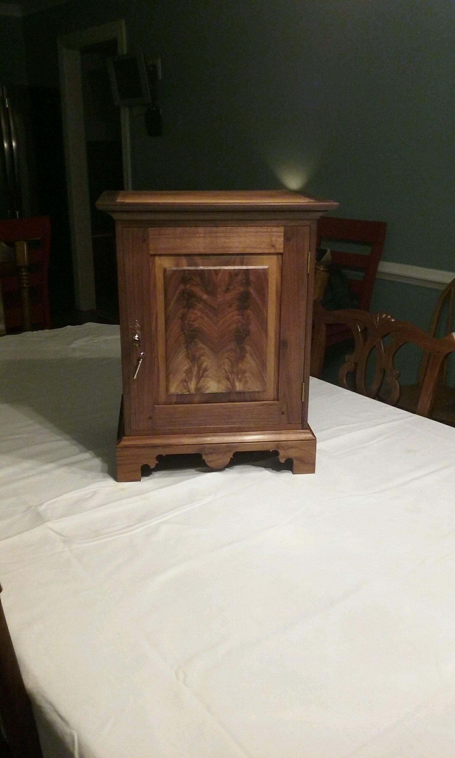 Guild Woodworking ProjectsOur first projects for this month’s newsletter comes from Jim Francis, somewhere near the Arctic Circle in an area called Wyoming! Furniture Heading West It's been a busy spring/summer in the shop to support friends and relative weddings/anniversaries/special occasions in Wyoming and Colorado. Shown are four Pennsylvania style keepsake boxes; three of black walnut, and one of wormy pecan harvested locally. In addition, there's a Pennsylvania style spice box of black walnut with two secret compartments (false bottom in the center drawer, and one behind the rear panel). The secondary woods are pine, poplar and cypress. There are a lot of dovetails (the boxes themselves, drawers, keepsake box feet and the tray inside the keepsake boxes), as well as mortise/tenons (keepsake box breadboard lid and spice box door frame). Also, with both box types there are all sorts of possibilities for personalization; carving as well as inlay. As an example, shown on the inside of the spice box door is an interesting design executed with holly stringing.