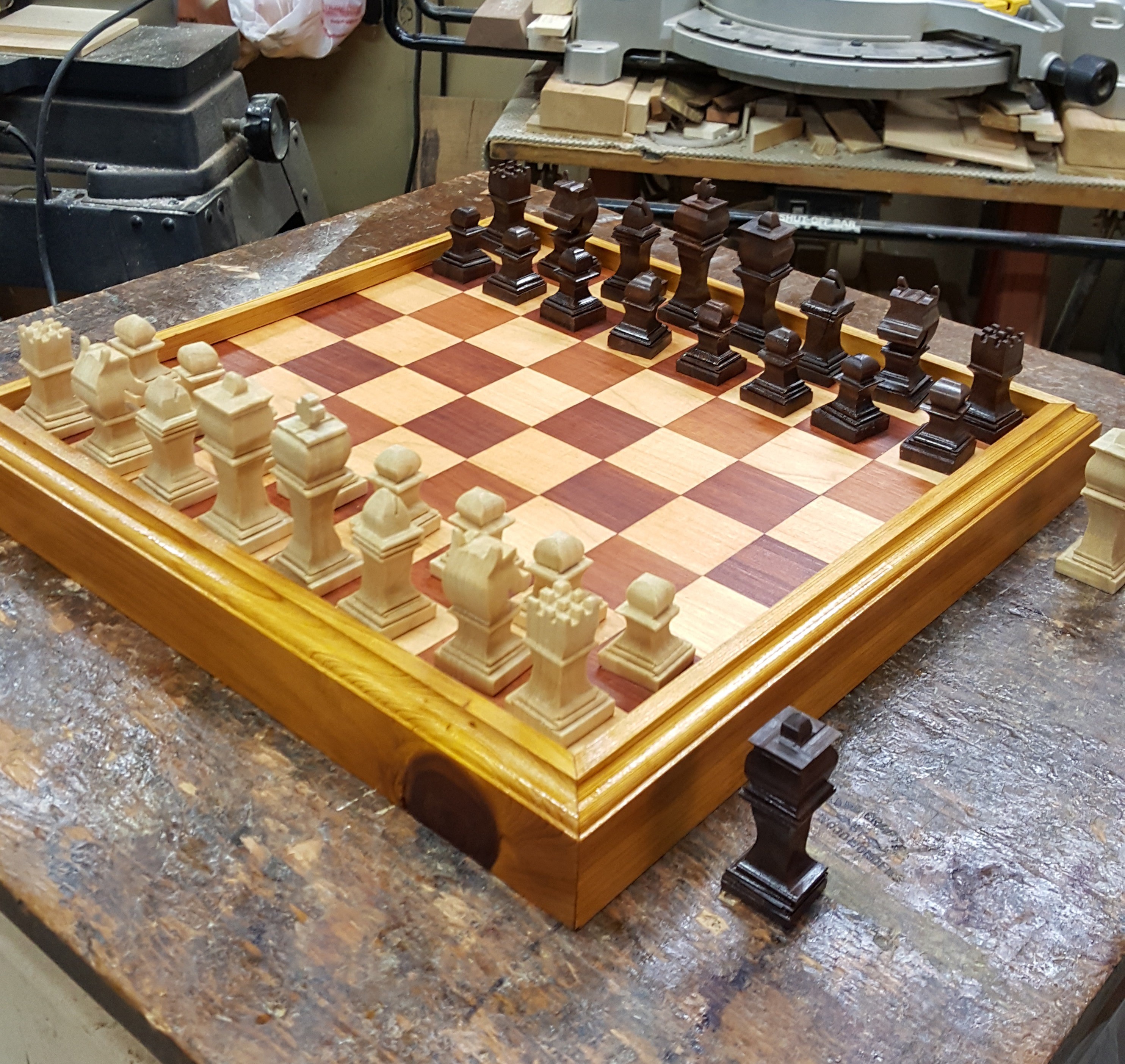 Guild Woodworking ProjectsEd Bunker leads off this months newsletter with his amazing chess board and chess men. The chess board is made of Mahogany and Maple and framed by Cypress. The chess men are made of Walnut and Poplar. The finish is several coats of shellac.