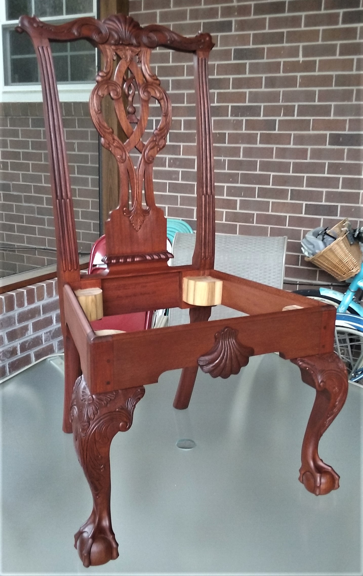 Carvers Unite! Student Perspective - Johnathan Shoemaker ClassThe Jonathan Shoemaker chair is a classic Chippendale piece involving a straight tenon/angled mortise build strategy, and a large amount of interesting carving. So when Ray Journigan offered a class on the construction and carving of this chair, I took advantage of the opportunity. Following are comments that may be of interest/use. Motivation to take Ray’s class: • Carving challenge; large amount with lots of nice detail. • Construction; another nice challenge similar, but different (angled mortises/straight tenons), to the Chippendale side and arm chairs I previously built in Ben Hobbs’ classes (angled tenons/straight mortises). • As with every other class Ray teaches, he comes well prepared with examples, notes, files, etc. Coupled with his knowledge, skill and teaching technique, the student leaves the class with a significant increase in knowledge and skill. Lessons learned/reinforced: Construction • Accuracy in tenon/mortise layout/cutting/chopping can’t be overstated. This accuracy is necessary to achieve the rear stile splay (two degrees) as well as rear to front leg spread (9 degrees), and minimize any rear to front racking. Using angled jigs to chop mortises were particularly useful. • Homemade clamping jigs and attention to proper clamping technique help minimize racking/distortion. Carving • Leaving detail out of the initial outlining work enabled backgrounding to proceed more quickly and easier. It was interesting that most of the background was removed with #2 gouges. • Detailing using gouges, with a philosophy of treating the same features in the same manner with the same gouges, made this work easier and faster. • Veining, which typically for me is often a struggle, produced better results using a strategy of making each vein mean something (i.e. replicate what is seen in nature). If you’re considering building this chair, following are keys to success: • Be familiar with Chippendale chair construction. Articles in the SAPFM journal are a good resource. • Start with absolutely sharp carving tools. This will shift the focus from tool related issues (i.e. blowouts, busted pieces) to technique and achieving the intended carved design. Closely study available pictures and samples. • Understand the process of roughing in and backgrounding. • Be comfortable carving shells, ball/claw feet, gadrooning, and acanthus leaves before undertaking this project. The carving work on this chair will then be easier, more enjoyable and quicker. Bottomline: This class will bring your carving and construction skills to a new and much higher level. Well worth the effort. Jim's Carved Chair Jim Francis |