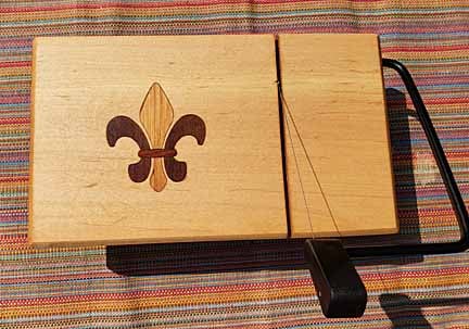 Guild Woodworking ProjectsOur first project comes from Karl Bogot. Project 11 for the year is another slicer, this one with an inlaid Fleur de Lis in 3 different woods. This is a 'large' board, 5.75" wide by 10" long" and treated with food safe mineral oil and bees wax. This board is available for sale at $35.