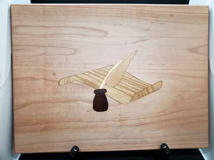 Karl's second Project 21-12 is a completely original design and execution of a scroll and quill inlay on a maple board 11 x 15 x 7/8. There are seven inlays in four different woods. This is a router template project similar to the Multi-Layer Inlay System, but I made the templates for this one.