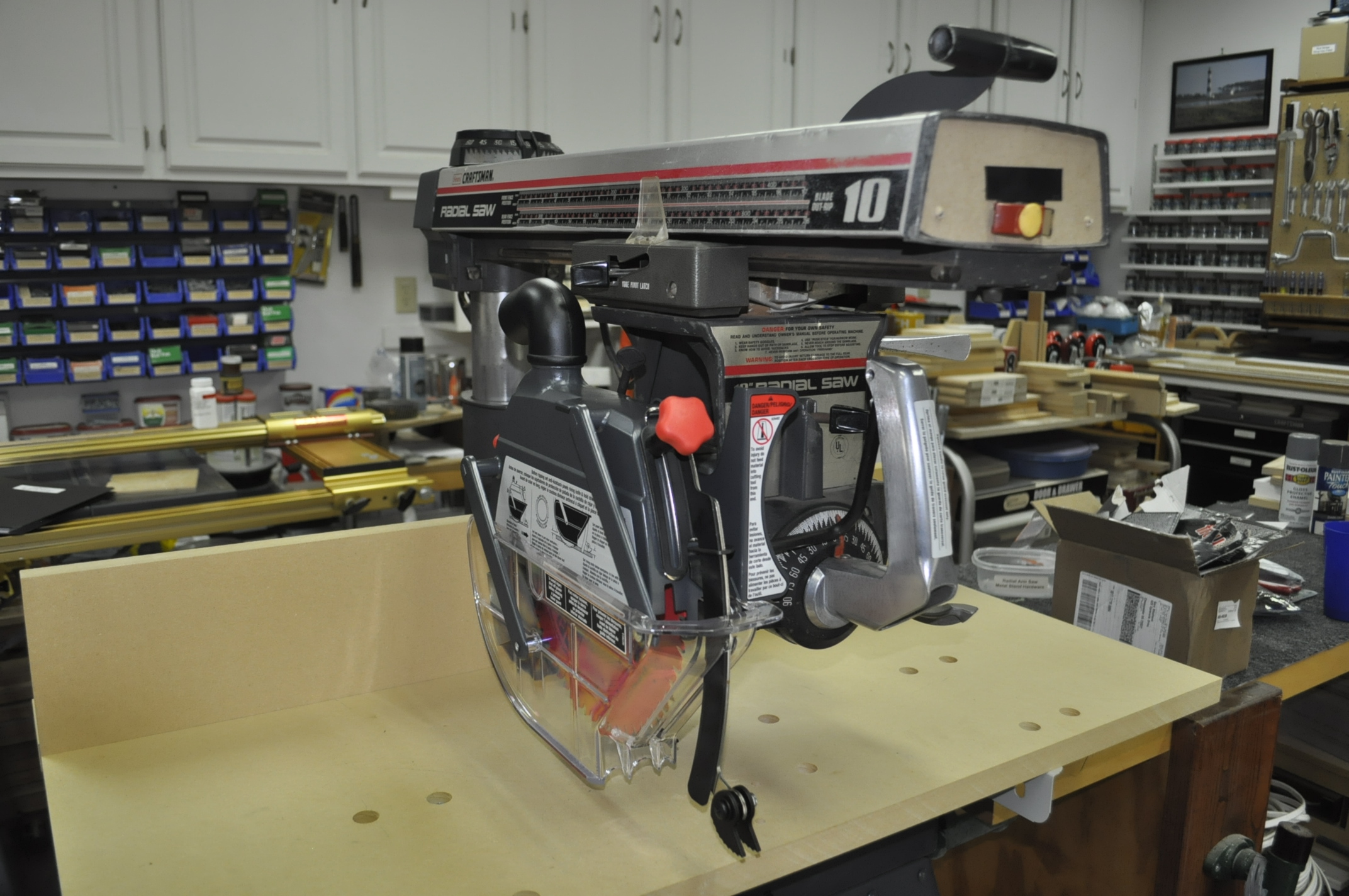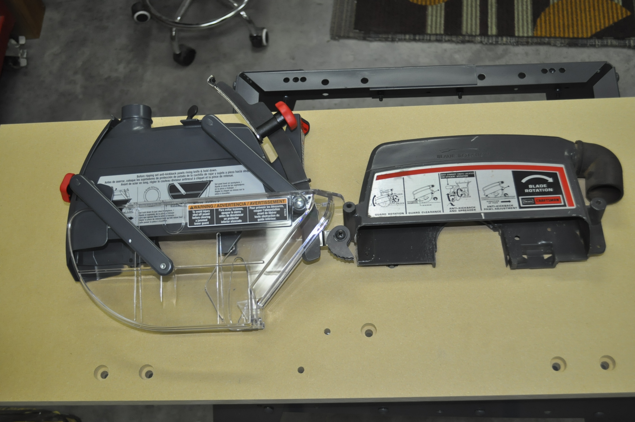 Craftsman Radial Arm Saw Photos After Restoration Craftsman Radial Arm Saw Photos After Restoration One of the big complaints about radial arm saws was that they were dangerous, particularly because of saw blade technology and the way the saw cuts. They had a tendency to grab the wood and actually climb over the piece of wood that was being cut. Very scary. During the upgrade process I replaced the saw blade that was on the radial arm saw with a newer more modern design designed for sliding compound saws and radial arm saws. I chose a Freud 60 tooth10” saw blade with alternate tooth bevel grind and a negative 5 degree hook angle. This 5 degree negative hook angle helps prevent the blade from being too aggressive and pushes the work piece down and towards the fence. It is a thin kerf blade and removes less material that standard thick kerf carbide blades. One of the scariest thing about this blade happened a few days ago. This is an expensive blade running about $85. It was a special order from Woodcraft sometime back and I had it sitting on our kitchen island top and though nothing about getting it out to the shop until I was ready for its installation. Anyway, a few day ago I took my wife to the laser vision center for her cataract surgery consultation. Because they dilated her eyes I drove her over to the center and then went back home. I was only gone about 20 minute’s total. When I got home I found our face masks that we hang on the refrigerator all over the floor, papers and a notebook that were on the island were now on the floor and the remains of the box and packing material of the new, never opened Freud saw blade all over the kitchen floor and family room! All I could think was that Smokey, the Boxer dog had just ruined an $85 dollar saw blade. I finally found the saw blade in the family room and even though it had fallen about 40 inches from the island counter top onto the ceramic tile floor it looked undamaged. I think the box the saw blade came in took the brunt of the fall. Saw Blade Package After Smokey The Boxer Ate It! Another thing I like about the upgrade package to the blade guard is the new dust port. If you look at the pictures below you can see that the dust port on the old blade guard came out right in front of the blade and in your face! The new blade guard dust port takes the dust out the back and away from your face.