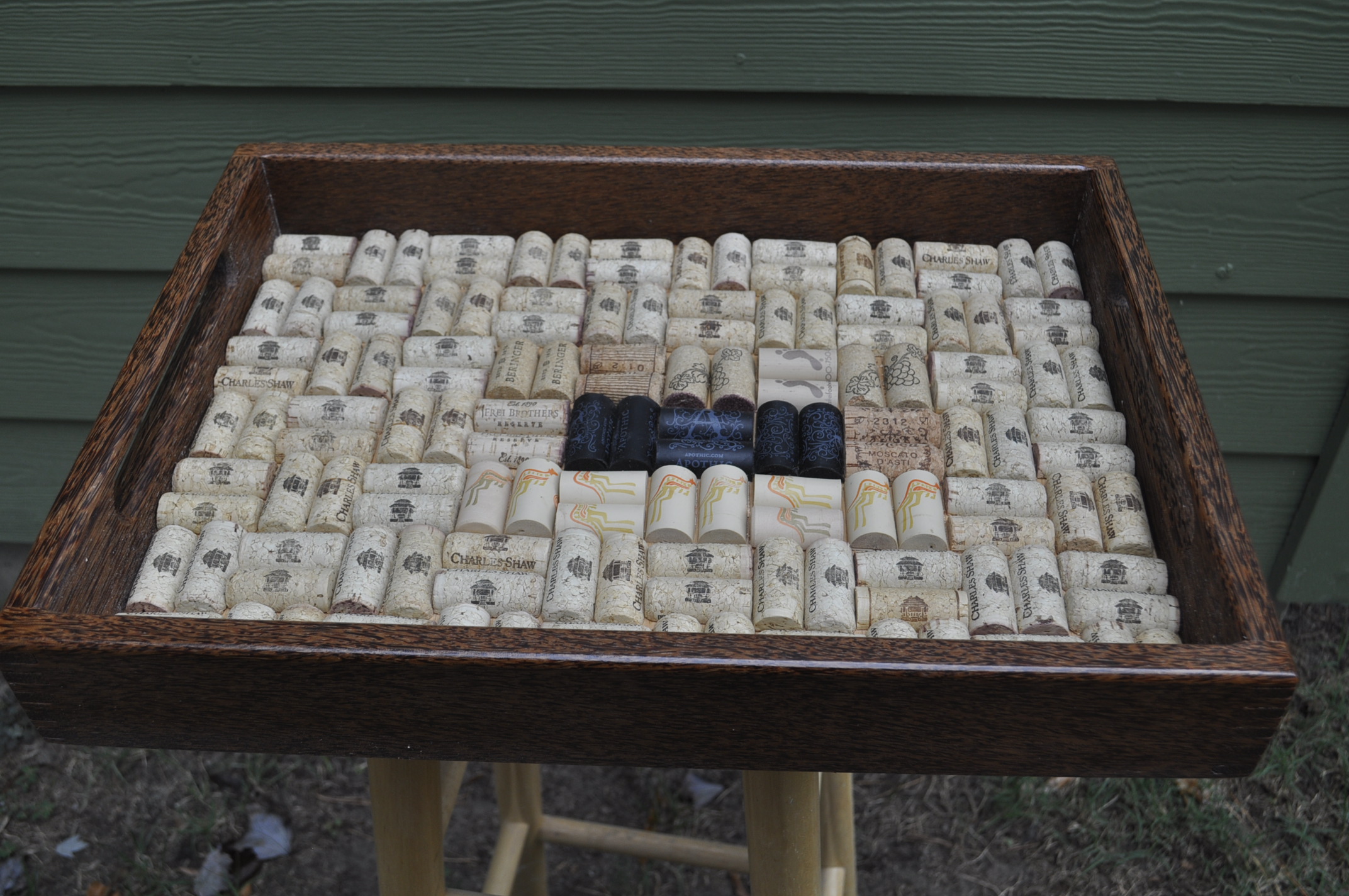 Project 21-12 is a completely original design and execution of a scroll and quill inlay on a maple board 11 x 15 x 7/8. There are seven inlays in four different woods. This is a router template project similar to the Multi-Layer Inlay System, but I made the templates for this one. The next project comes from Gary Stephens. If these projects look familiar you have a good memory. Back in January of this year I featured two of these serving trays made out of Red and Black Palm "wood". At the time I had cut out the material for four of these serving trays but I wanted to finish two of these trays with a high gloss spray lacquer finish. It was the winter and my heater was running and I did not want to stink up the shop with lacquer finish or have the potential for a flash explosion so I set two of the serving trays aside until warmer weather. I finally got around to getting back to the final two serving trays this month and finishing them the way I wanted without blowing up my shop. One of the nice pleasures of making these serving trays are the corks. It takes 70 corks to cover the the bottom of the serving tray. 70 bottles of wine on the wall .... Working with the palm wood was different from normal hardwoods or softwoods. When cutting the finger joints on the table saw my sweat shirt that I was wearing looked like a porcupine sprayed it with hundreds of tiny splinters. When routing the curved edges of the serving tray it sounded like WWW III as the "wood" came off in long splinters and I thought it was going to destroy the wood. After turning off the router I found that the finish on the "wood" was very smooth but full of small splinters. Red Palm Serving Tray And Cork Arrangement Detail Black Palm Serving Tray |