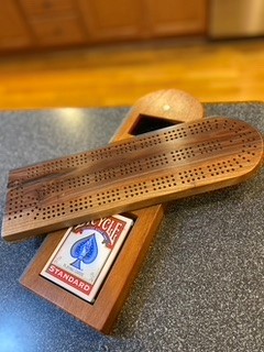 Guild ProjectsThese next projects come from our president, Fran Foster. Cribbage is becoming more popular and I decided to make a board for two of my daughters’ families. I used walnut and mahogany for the different parts and as you can see, they were made with what could be considered “scraps” if there is any such thing when you talk about those two woods. The holes were drilled on a drill press following a pattern that was downloaded from the Internet. A much slower process than using a CNC machine, but only took an hour per board!