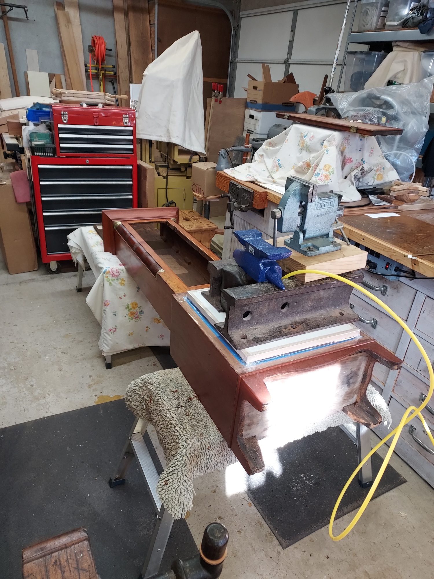 UFOs (Unfinished objects). Last year ended with a sleigh style bed still under construction which involves vacuum molded slats; a tall case clock case needing repair work also involving vacuum pressing veneer (picture P7); and new construction frame saws. With the new year, chair work (new construction corner chair, and three chairs requiring rebuilding) will add to the mess. So...that's a big part of my life. My how the days pass quickly! Now the quiz: How many frame saws did you see in the pictures? |